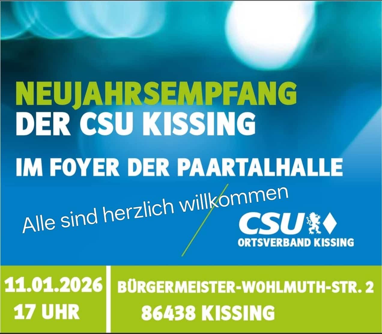 Herzliche Einladung an alle Kissinger zum Neujahrsempfang am 11. Januar 17.00 Uhr im Foyer des Erlebachsaal Bürgermeister-Wohlmuth-Straße 2, Kissing.